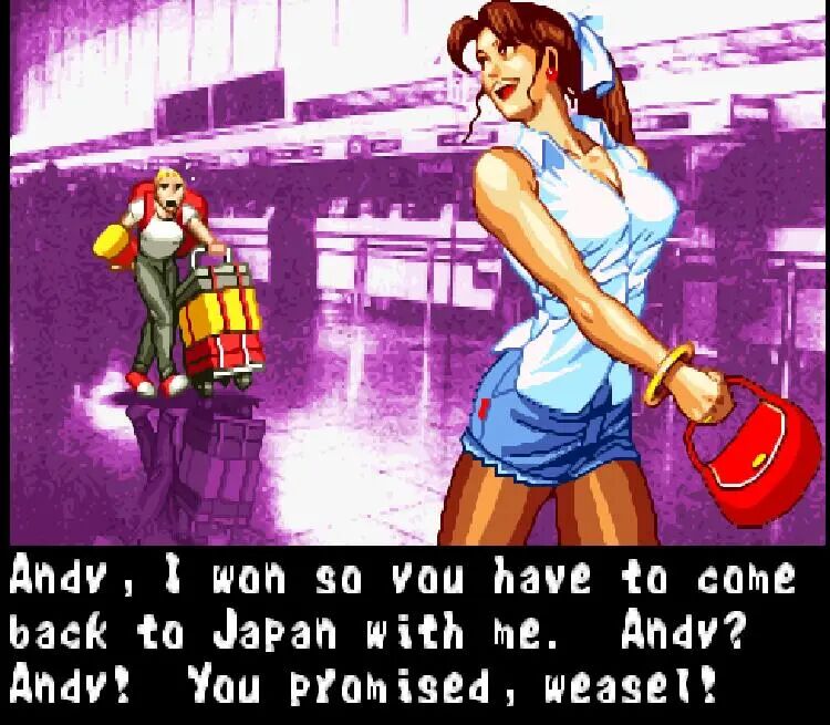 不知火舞击败两兄弟后,强行要安迪一起回日本,不知火舞故意让安迪拉着一大堆东西,背上还背着一个红色的背包。