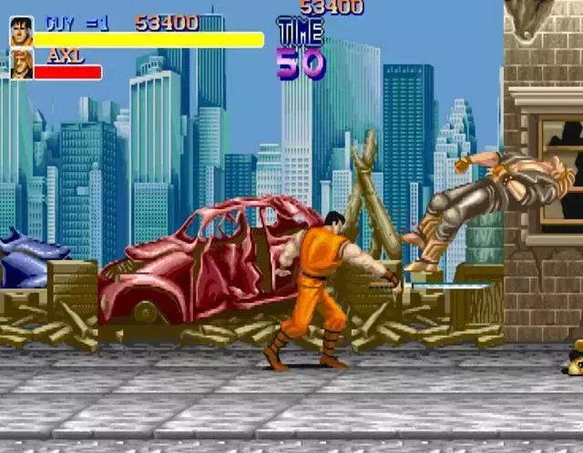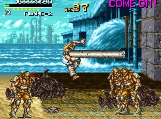 像是《电神魔傀》中,玩家捡到武器之后甚至能够使用武器发超必杀,和之前空手打出的效果完全是不同的;《快打旋风3》中的凯善用双节棍、市长善用钢管、立毛善用电锤、女警适用甩棍,都能打出套路来。