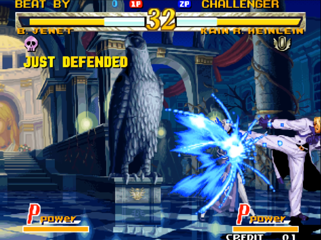 在《拳皇2002》中安琪儿的MAX2“生还宴会”也是如此,不过需要的条件不同,“生还宴会”需要挡格空中攻击,在成立的一瞬间点击BCD。
