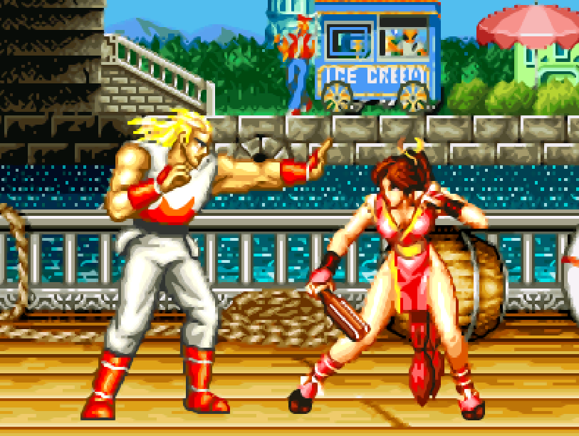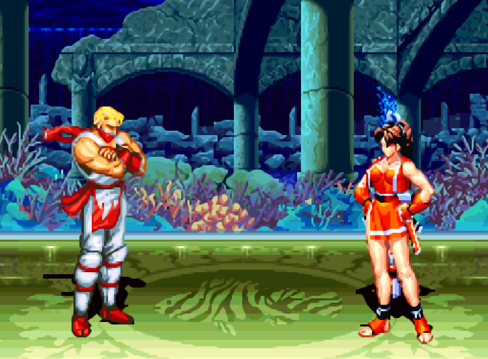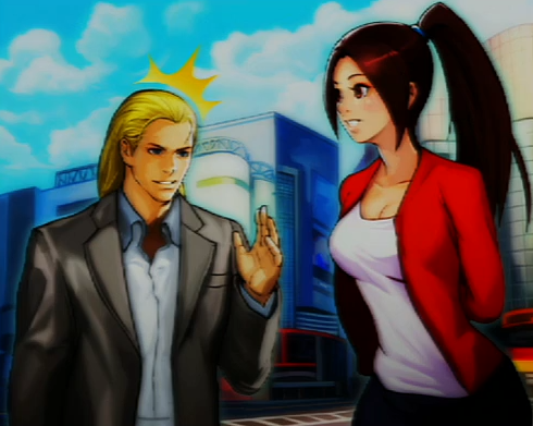 一直到《RB饿狼传说》中终于有了开场互动,不知火舞见到安迪就热情的打招呼,并做出吃定他的表情。