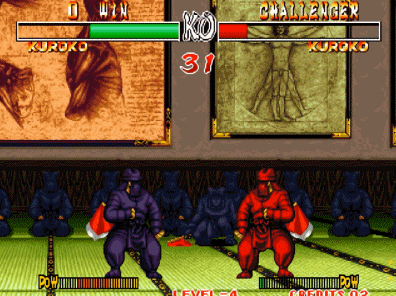 在《真侍魂》系列中拥有秘奥义的人物只有四个,分别是霸王丸“天霸封神斩”、娜可露露“流风之舞”、加尔福特和服部半藏的大隐身“忍法影舞”。这几招并没有什么实用价值,在实战中很少使用,不过却大大增加了游戏的娱乐性。