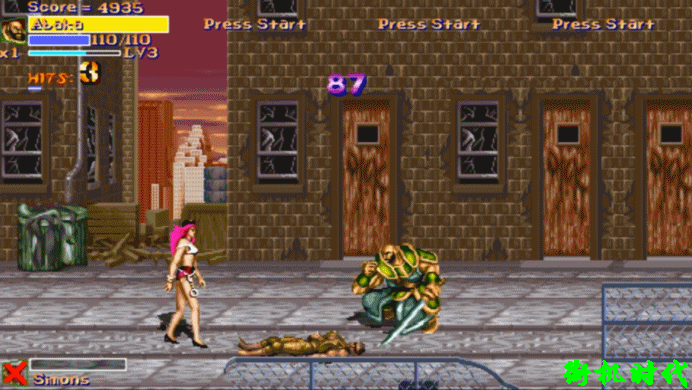 《恐龙快打》很多BOSS都是可以堵死在角落中的,四关BOSS可以使用小黄帽堵死,五关和六关BOSS所有人都可以堵死。