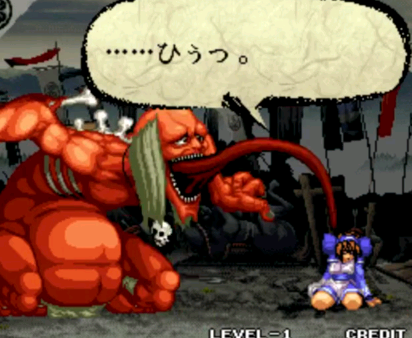 最后,饥饿成为他最在意的事。吃惯了各种人类之后他发现,小女孩的味道最为鲜美。《侍魂V》一开场,就是他追杀莉姆露露的画面。