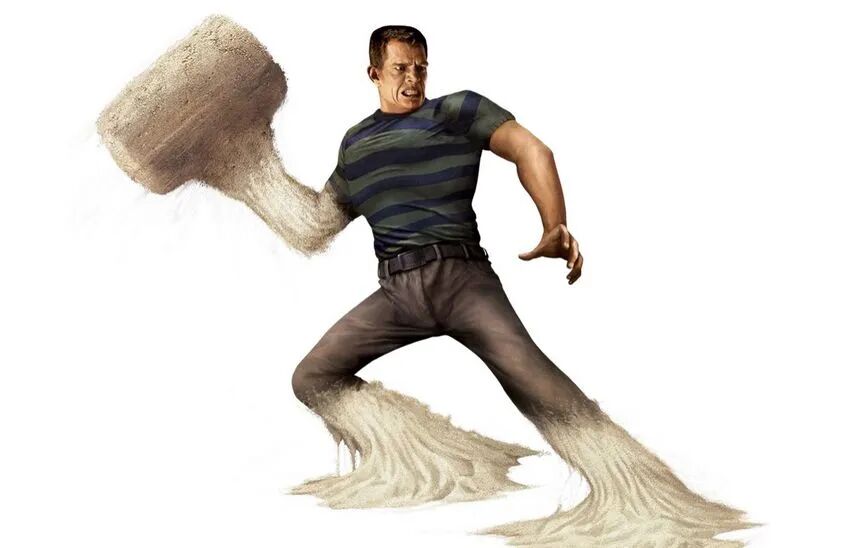 而在监狱中也不老实的他最终选择越狱,期间无意中闯入了核弹试爆区,在这一片受到辐射影响的区域中他的身躯逐渐被沙化,本来应该命丧于此的他却大难不死,并得到了操控沙子的能力。