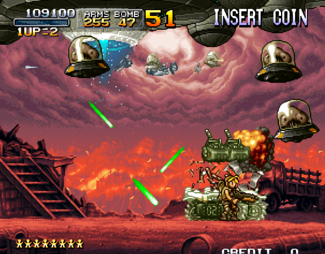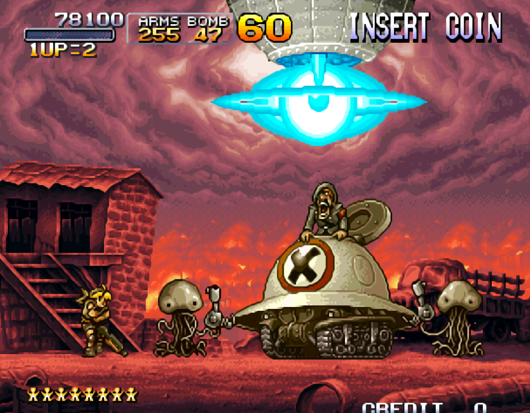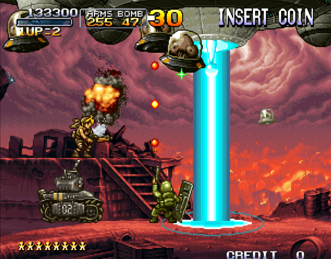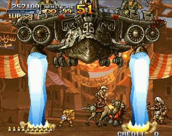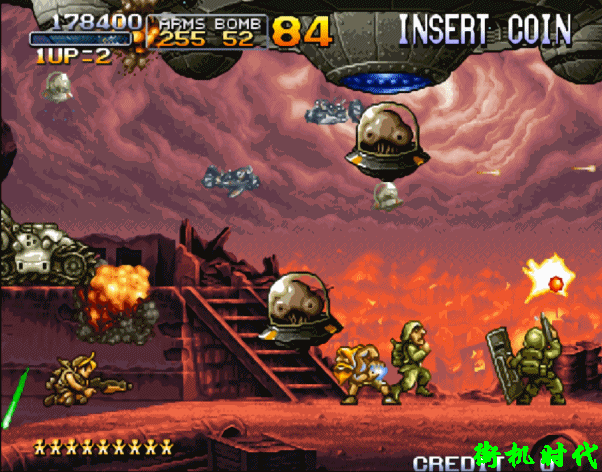 而玩家们认为最精彩的BOSS战来自《合金弹头2》,正规军和叛军联手对抗火星人。