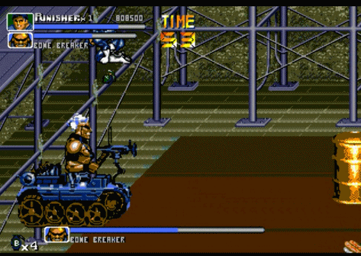 在MD平台的《惩罚者》中,主角是可以将它直接举起来扔掉的。这在街机版中无法实现。