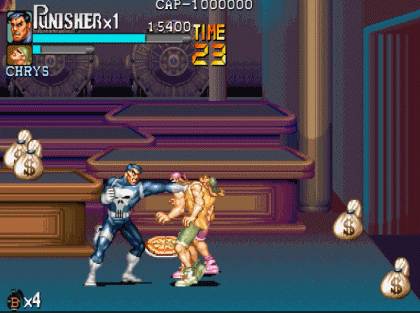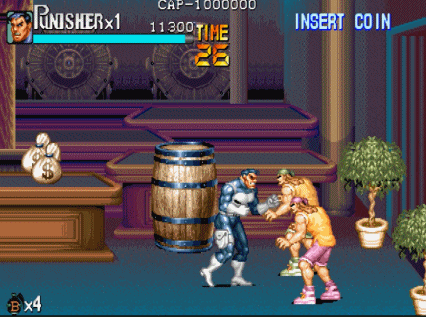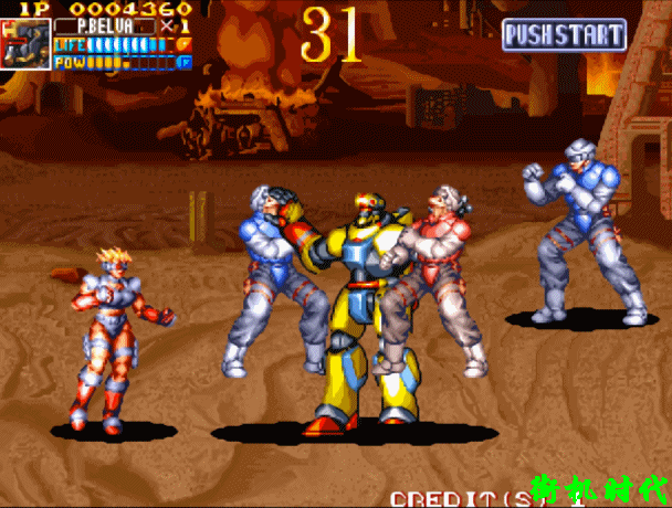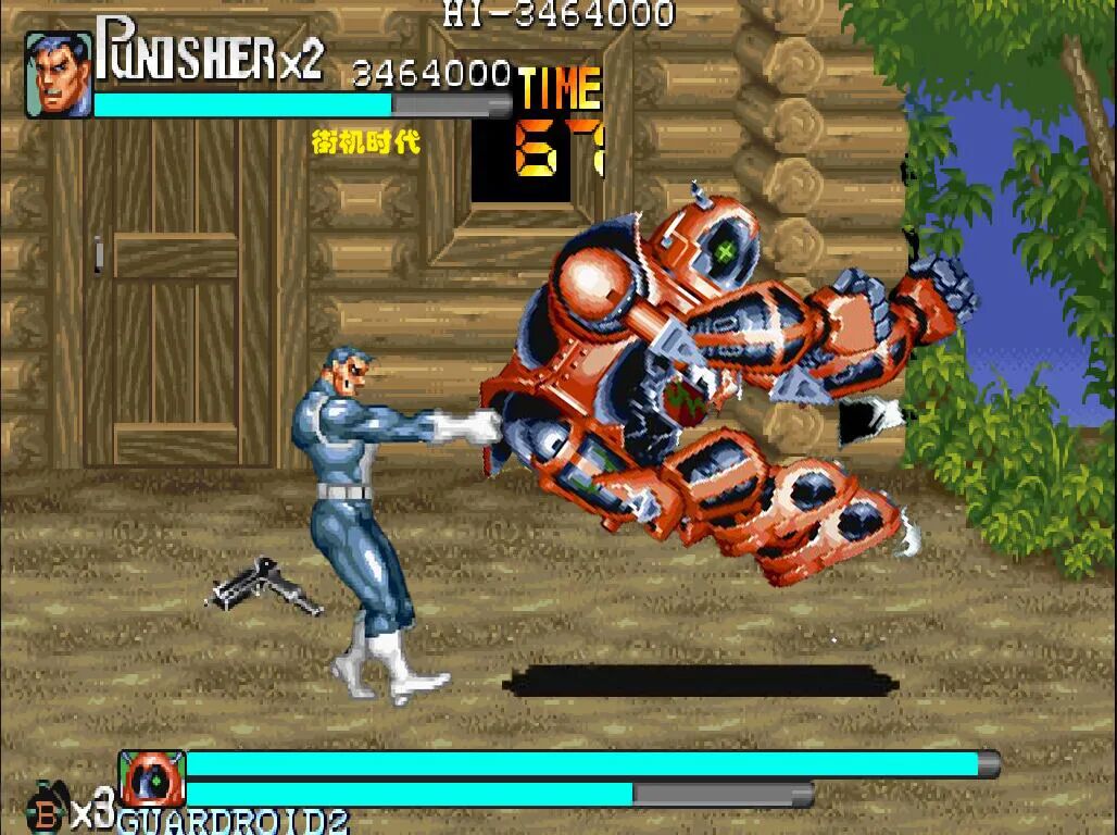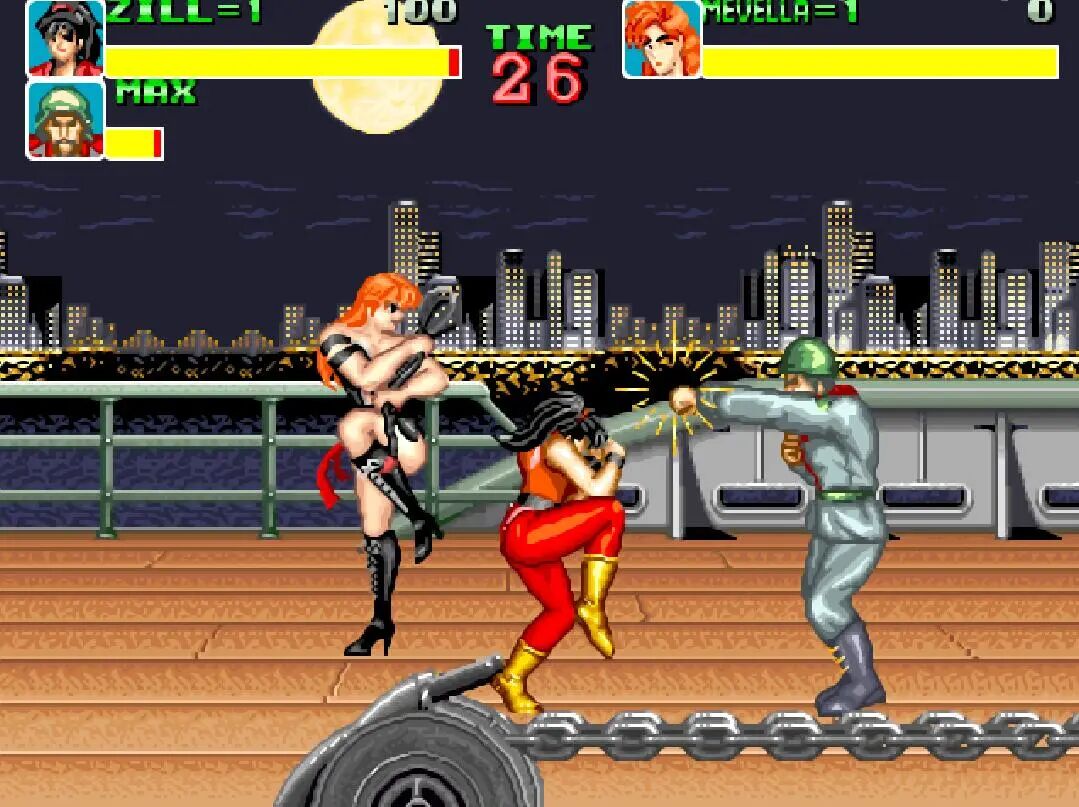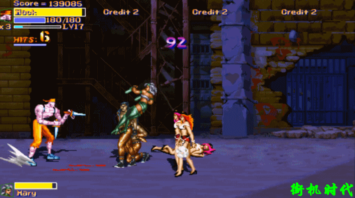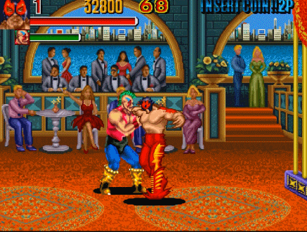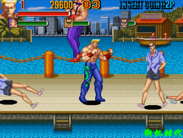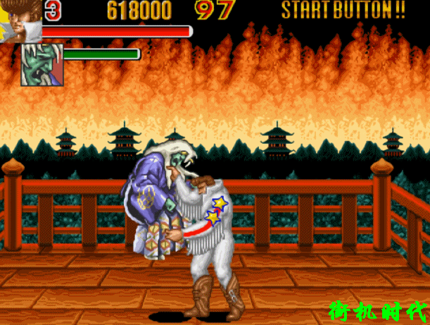他是街机游戏史上非常罕见的,甚至有可能是唯一的一位可以同时抓住两个人转圈圈的人。抓住一个人或者抓住两个人都是可以转的,只是效果略微有些不同而已。