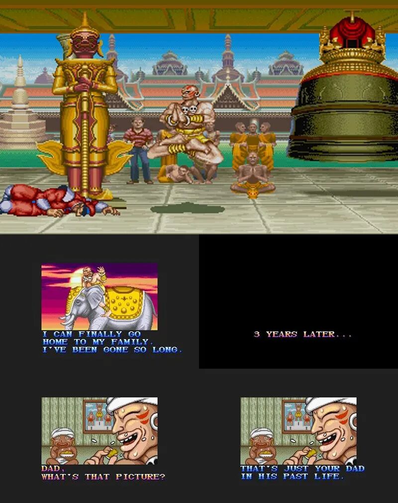 在其他的主机平台中,剧情都是差不多的,一家人其乐融融的画面。只是画风稍微有点不同而已。在《街头霸王》系列中达尔锡姆一直没有被维加针对过,一家人幸福生活在一起。