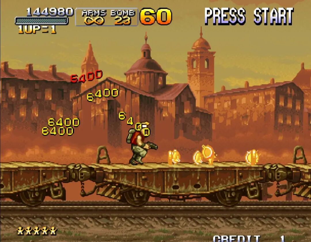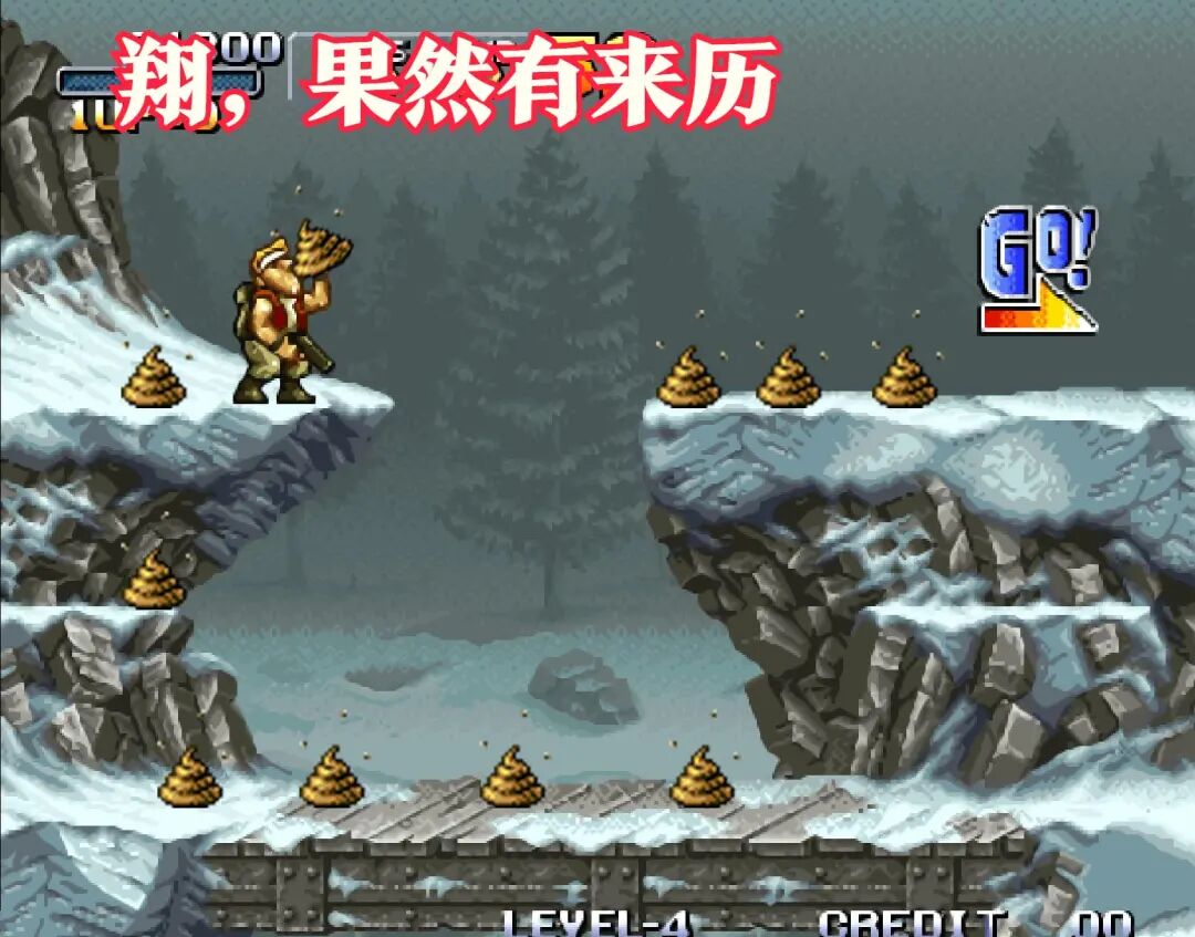 金币第一次出现是在《合金弹头1》中,这个版本的分数相当的严谨,没有什么爆分的操作。而金币也只出现了四枚,吃到之后最多叠加四次效果。