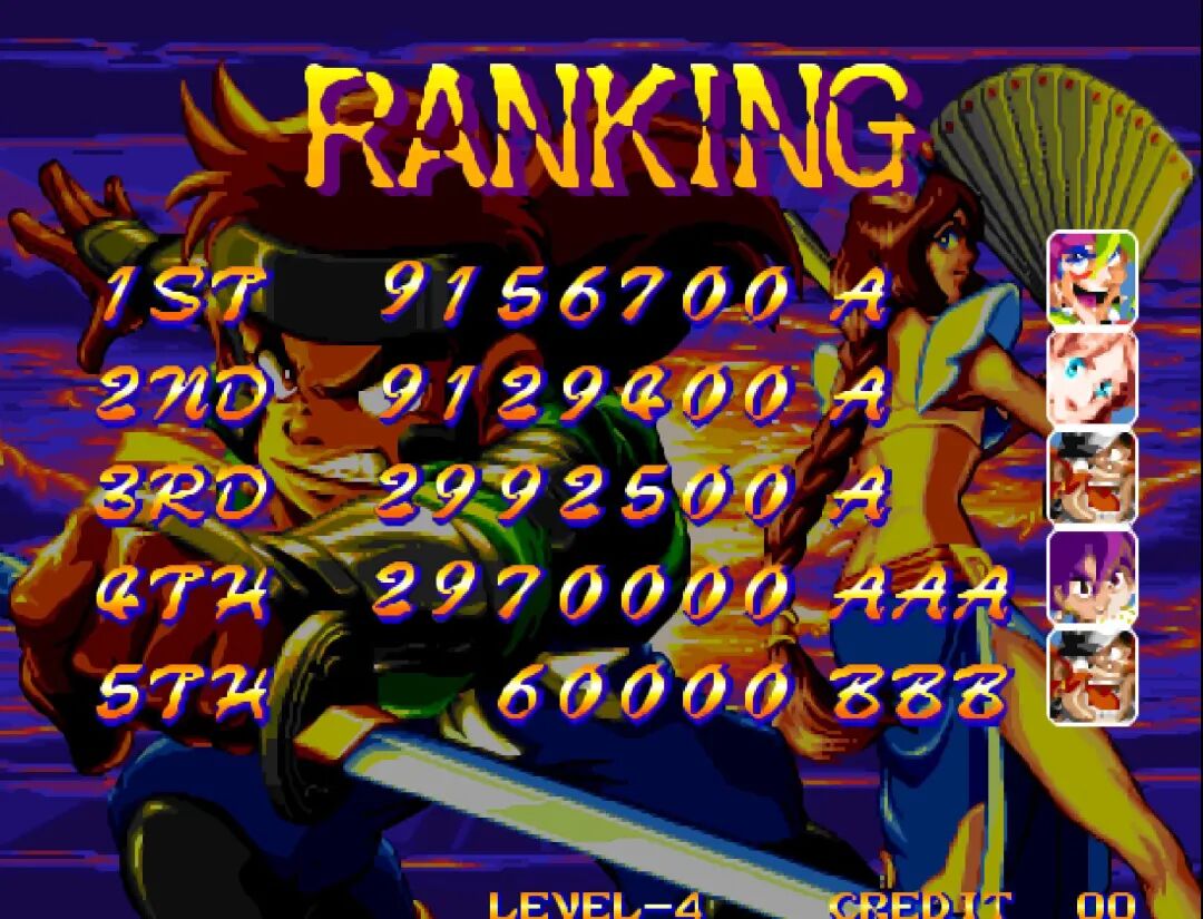 还记得当年在外地的一家游戏厅,无意中看到了《真侍魂》高分排行榜。我们一般通关能有一个几十万分就已经不得了,但是在这里居然看到了9999999的高分,不知道是不是已经达到极限了。