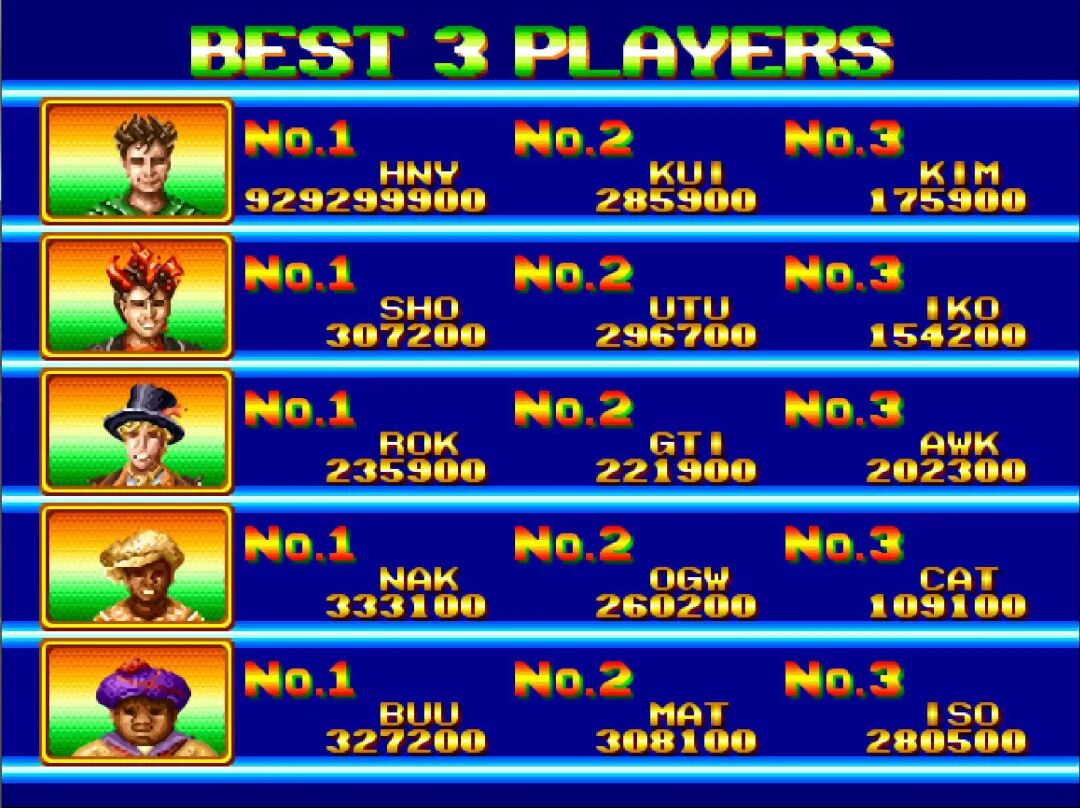 游戏厅时期很多玩家对于这些排名都不怎么关注,毕竟很多机台在重启之后排行榜就消失了,CPS1就是如此,没什么意思。因此我们当天看到的排行棒上面几乎都是AAA。就是玩家懒得输入,只想跳过记录快点进入游戏。