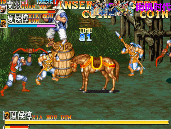 操作方法有点难度,先将夏侯惇打下马,然后抓住他跳上箱子。此时夏侯惇很有可能会跑去骑马。于是就出现下面这个死机画面了。