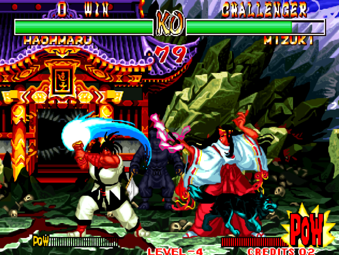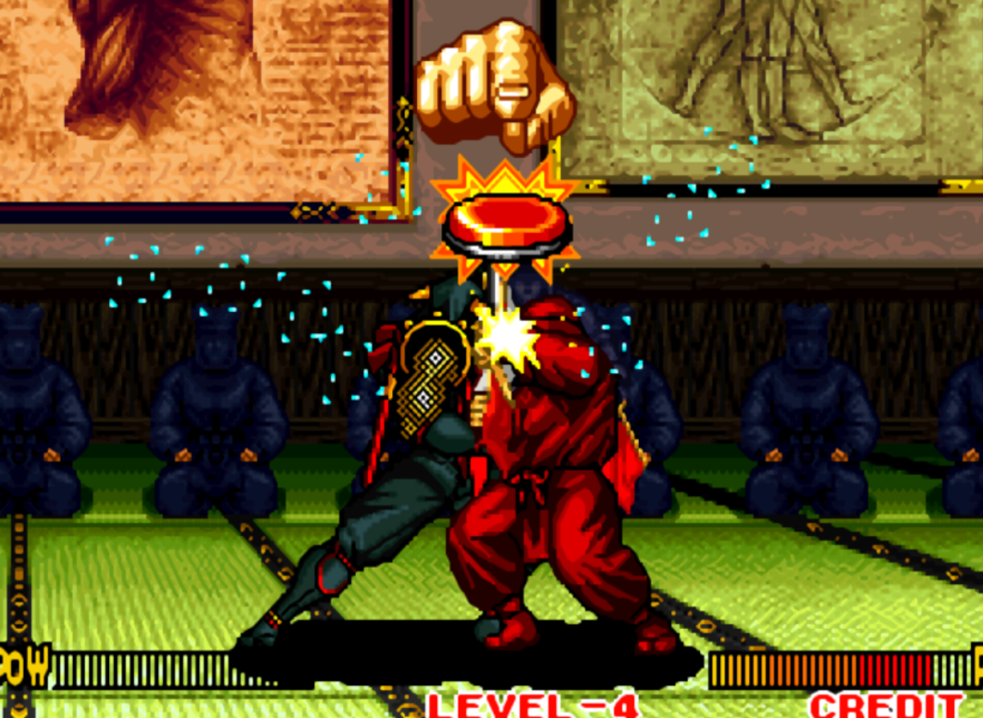 从初代开始《侍魂》就加入了“拼刀”的设定,当和对手兵器相接,或者同时冲刺的时候就会发生“拼刀”。初代的拼刀是随机分胜负的,虽然系统提示你要点击按键,但是点不点都不改变结果的。