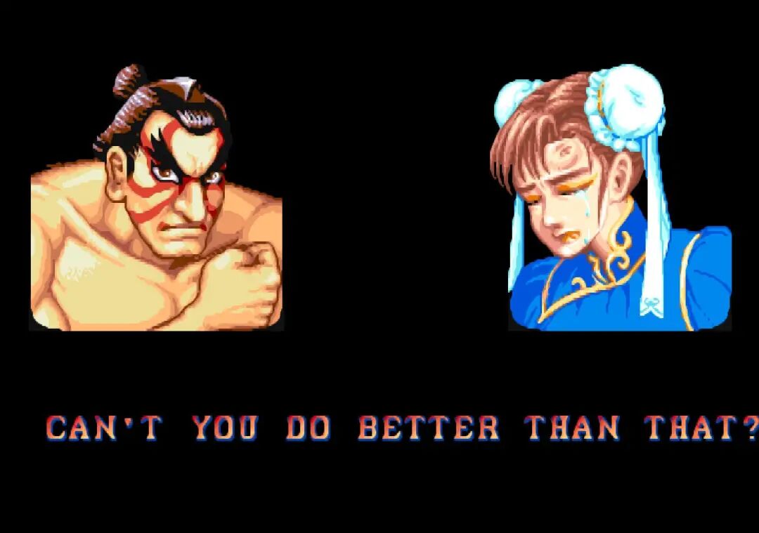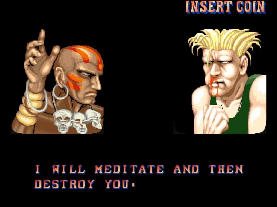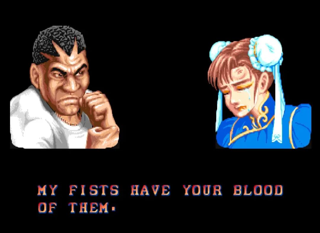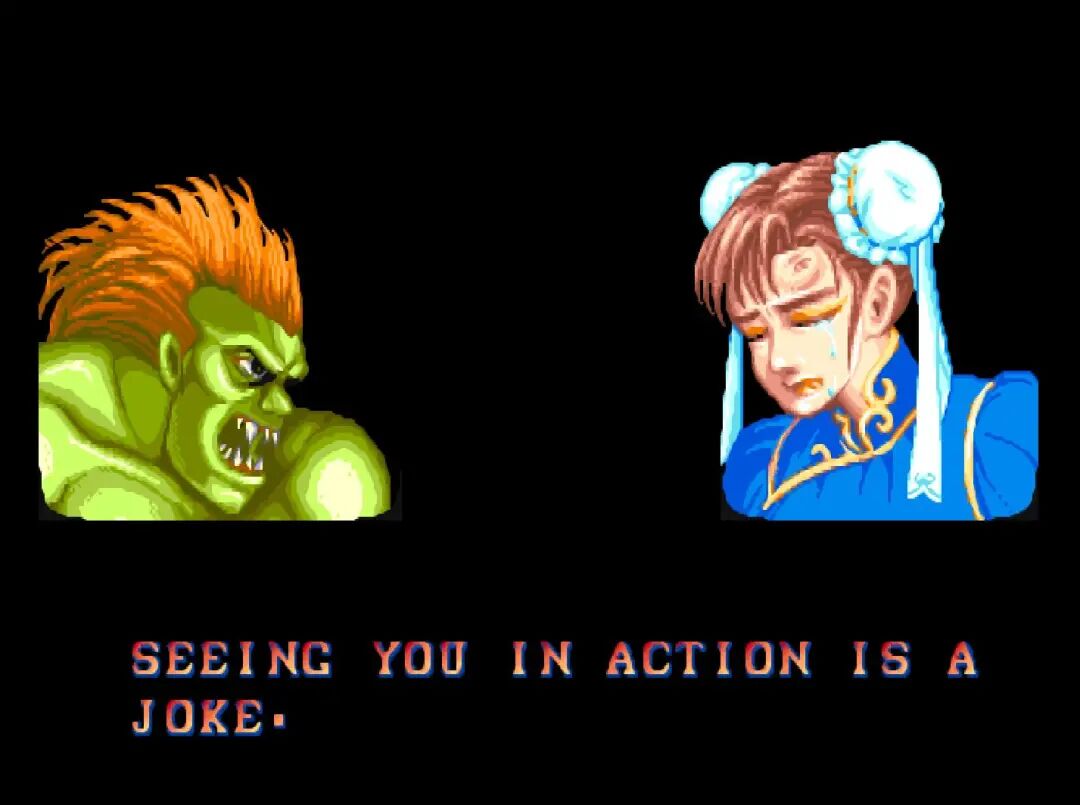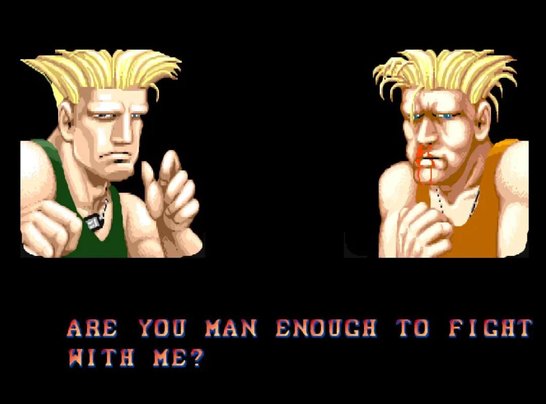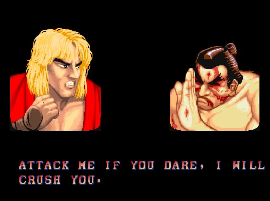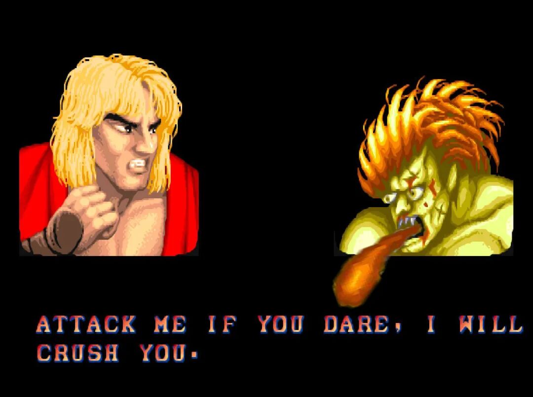 《街头霸王2》这边也是放狠话。当时《街头霸王2》的剧情还没有完全铺展开来,因此每个人物胜利之后的对话都带有浓浓的挑衅味道,而且无论对手是谁说出来的话都是一样的。