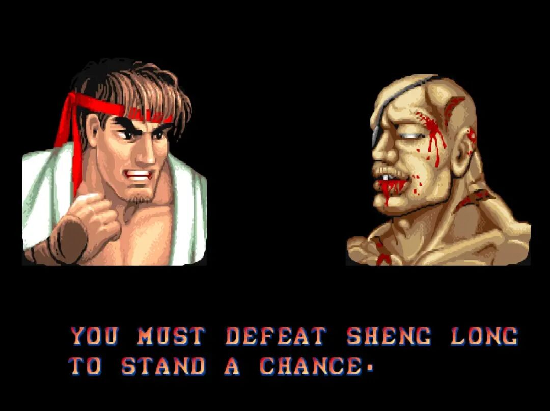 隆在这里提到的“sheng long”,当时也不知道是怎么翻译的,非要使用这种类似拼音的组合方式。导致这句话的意思完全被扭曲了:“要想打败我,就必须先打败圣龙!”