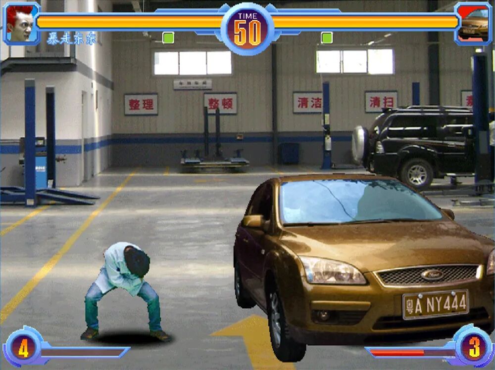 隐约还记得游戏中也有砸车的奖励关,每个人物都能在这里大显身手。最有意思的人物则是健次郎(包工头),光个膀子拿个铁锤戴个安全帽,使用着一手北斗百裂拳。居然可以将汽车直接抓起来大坐,让人忍俊不禁。
