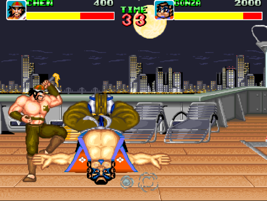 最最有意思的是,虽然是格斗游戏模式,但仍然保留了费血技能(保险)。也就是说只要你的血量比对手多,你就可以一直释放保险,将对手磨死,反正没有击中是不扣血的。
