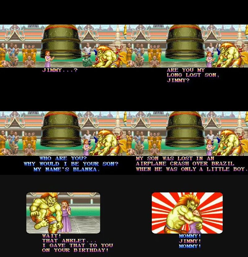 无论是哪个版本,只要是《街头霸王2》布兰卡的结局都是母子相认的结局。