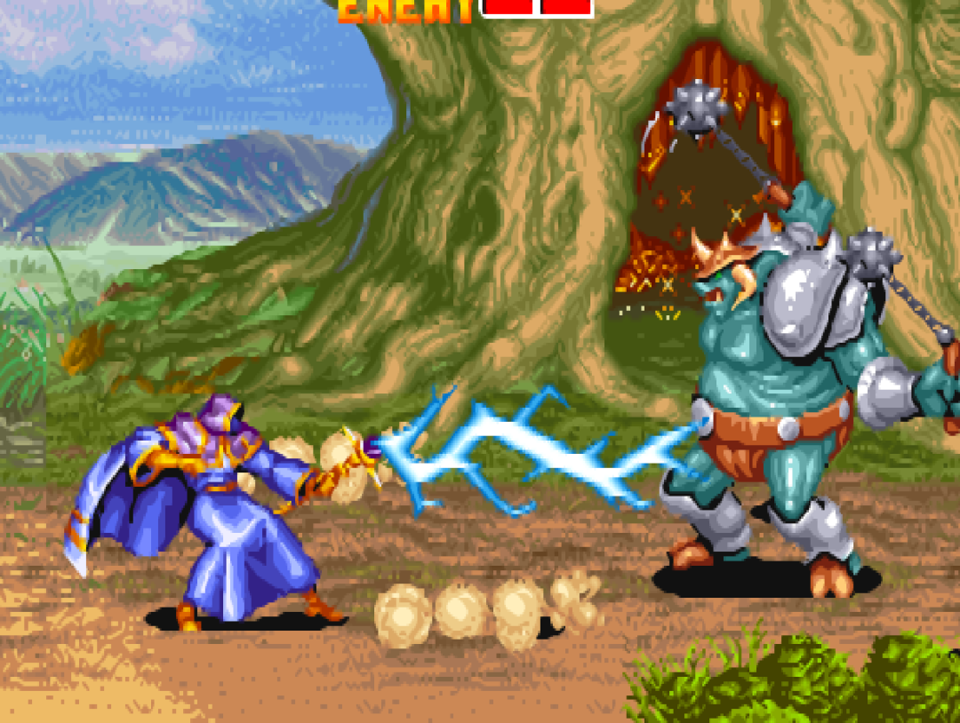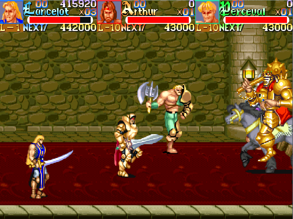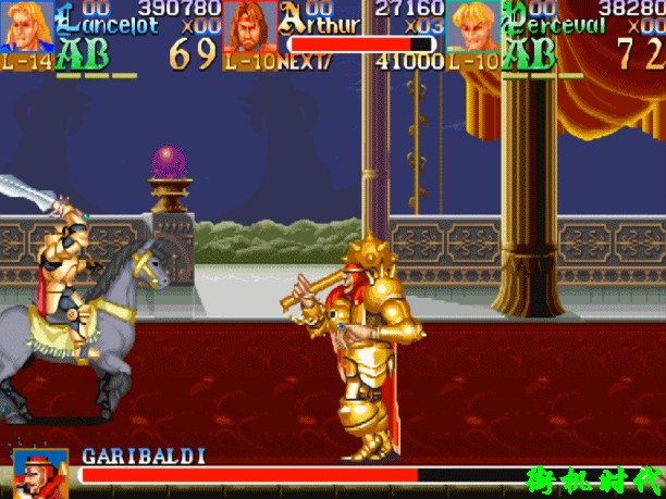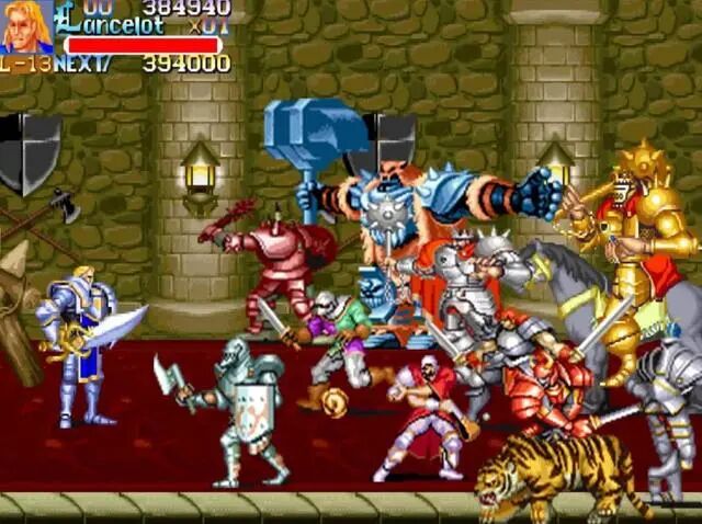 游戏厅那会,我们都喜欢使用兰斯洛特,然后在二关故意死一条命,到了三关之后砍出金娃娃、银娃娃和魔杖。要是能挨到最后一关的话,还能在开场的时候打出一个金娃娃。