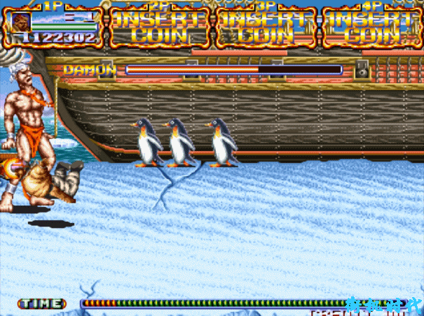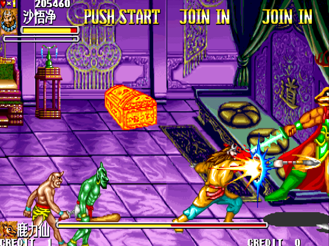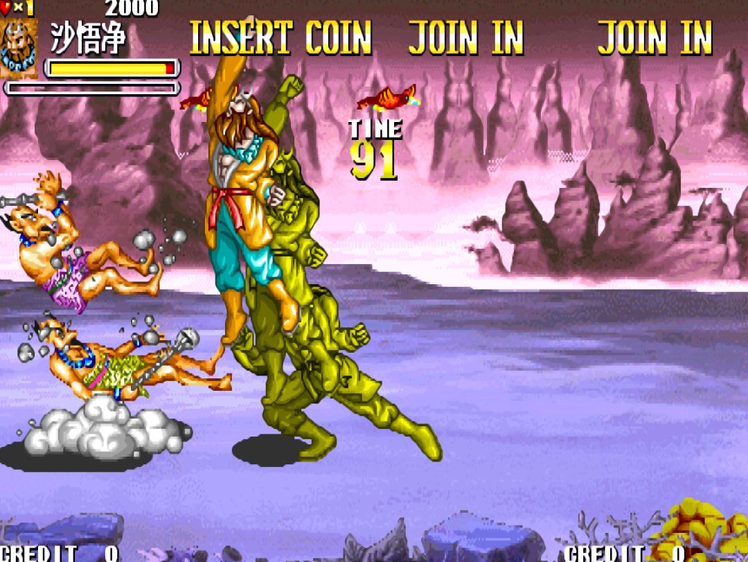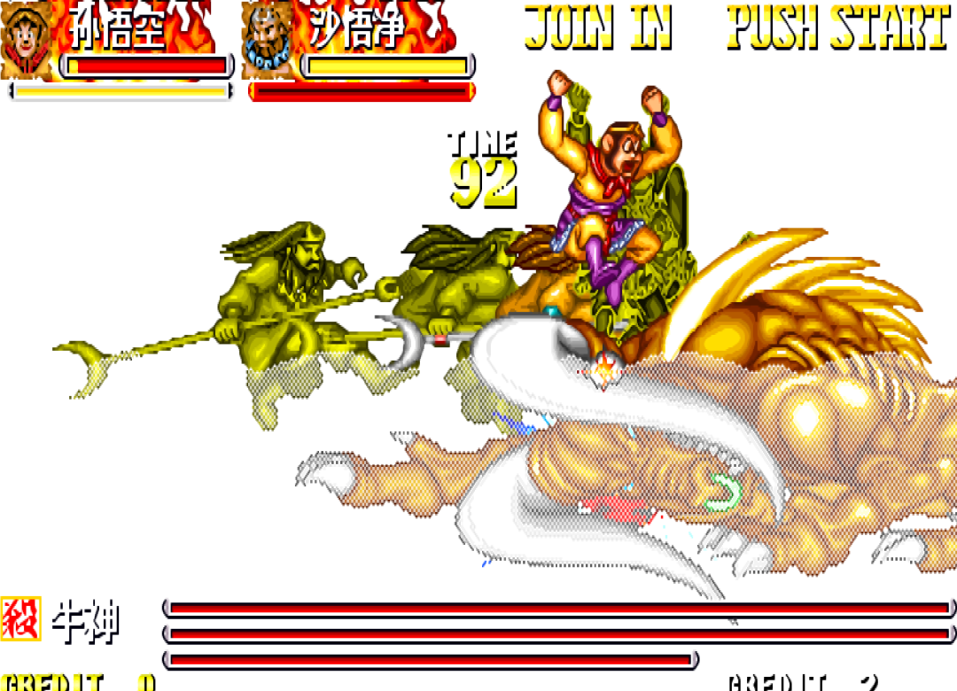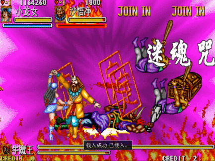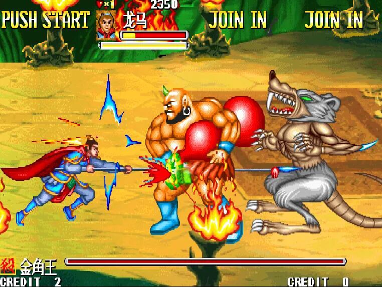 老板比较狠,将游戏的难度调得比较高,基本上释放一次超必杀技能量就消失了。只有孙悟空和龙马两人的节奏刚好合适,可以从头连到尾。猪八戒和龙女容易将BOSS推到角落中去,沙悟净又太快了。