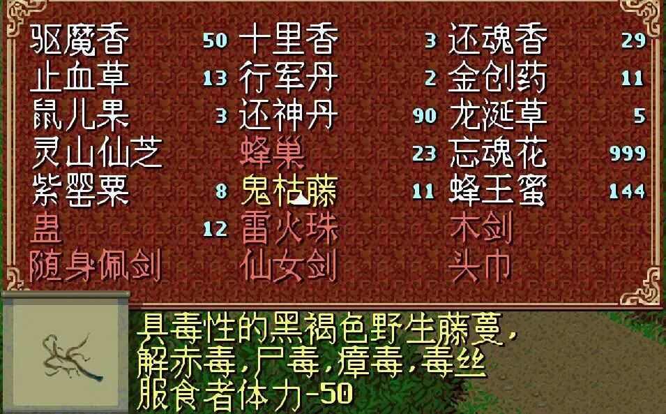 鬼枯藤,在原版中就是垃圾,最多用来练练蛊。但在这里却是非常重要的道具,可以解好几种毒。在游戏中后期,怪物们都有很多种毒素伤害,甚至还会累积起来消耗我们的生命,不解毒很容易死。