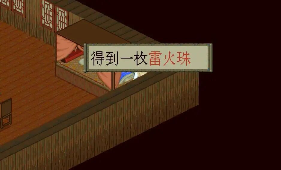 在客栈的床头的角落中,有一颗雷火珠(以前梅花镖的位置)。这玩意可是非常重要的道具,要是你没有捡到的话,很有可能会在前面死几次。