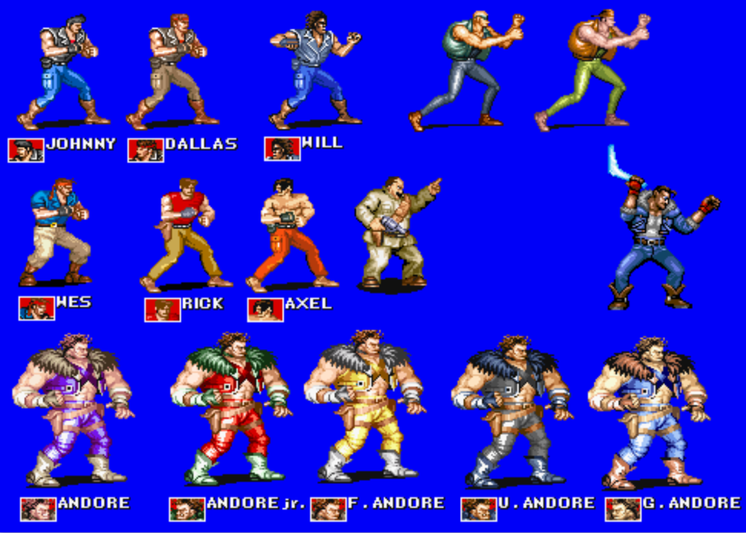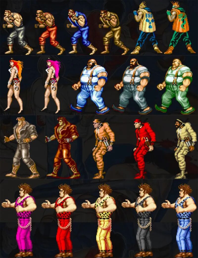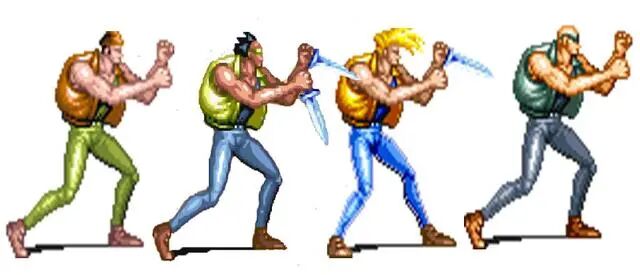 数来数去,你会发现《快打旋风》中的敌人只有七种,而每一种敌兵又有好几种颜色。这就给我们一种错觉,不同皮肤就是不同的敌人。