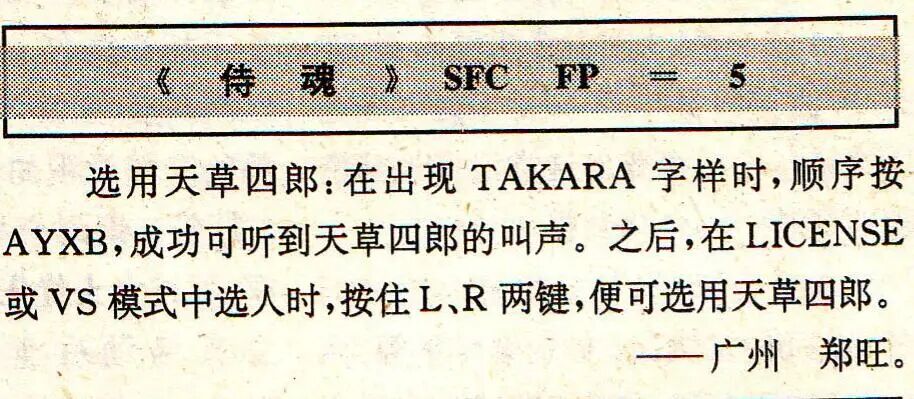 这是SFC平台的《侍魂》秘籍,但那时候真心不知道,以为街机版的也能这么玩,甚至还将这一段抄下来带到学校中找大家研究研究。