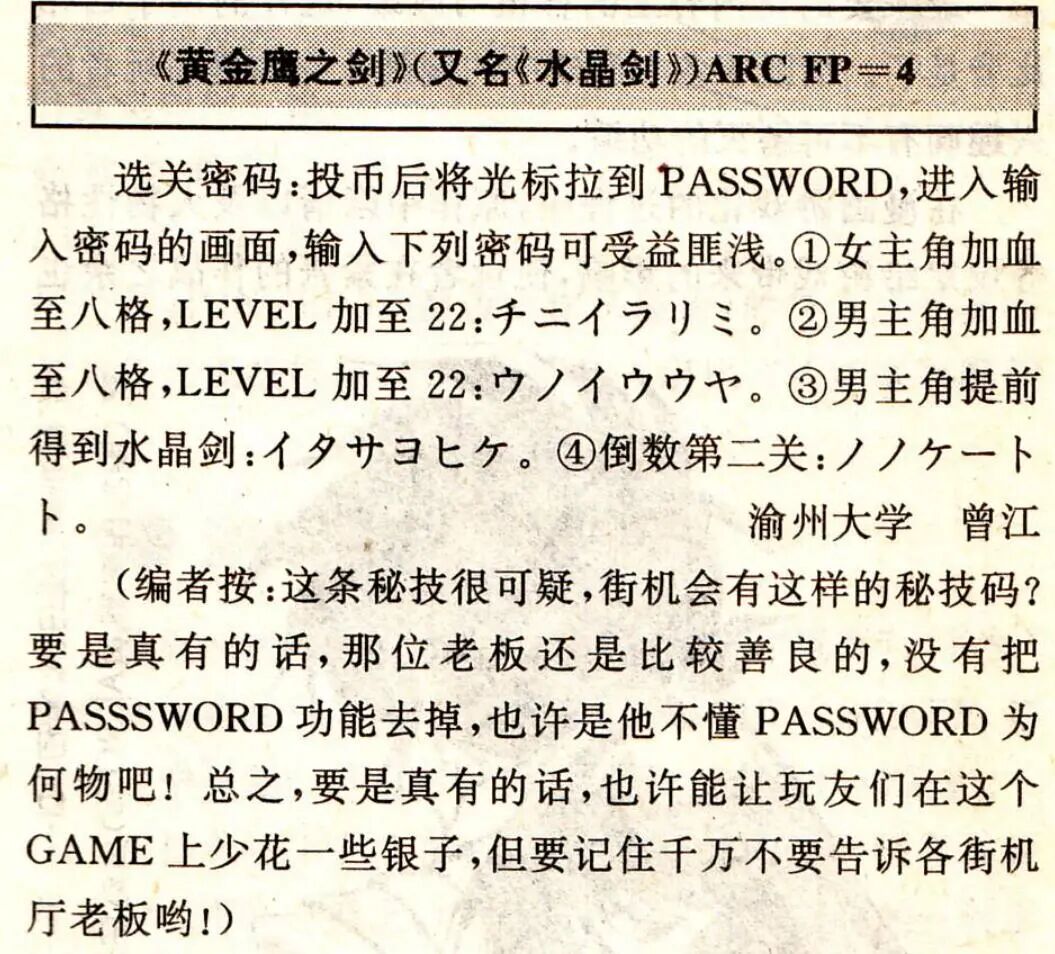 搞笑的是,当年杂志社的编辑们看到一位玩家的投稿的《黄金鹰之剑》秘籍,当场就懵哔了。甚至还在秘籍下面加入了评语,表示出对这条秘籍真实性的怀疑。