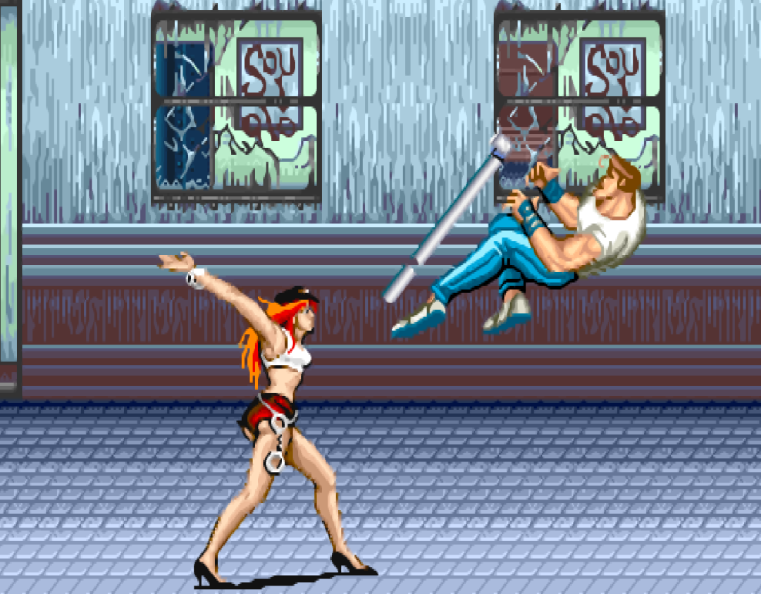 那自然就要提到《快打旋风》中的毒药了,准确的说应该是ROXY。毒药主要攻击方式是踢腿和飞踢,而ROXY则是掌掴和肘击。
