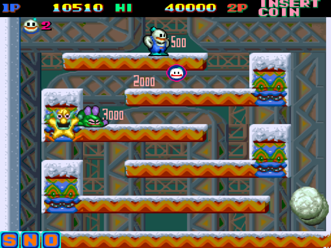 《雪人兄弟》的奖励关非常特殊,是一个“大头娃娃”触发的,在吃到之后就会出现几只带有字母SNOW的小怪,每推出去一只就会得到一个字母,得到完整的字母就可以奖命了。