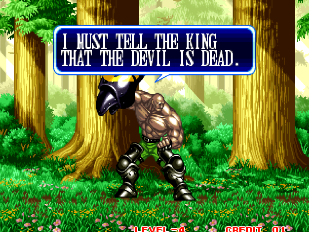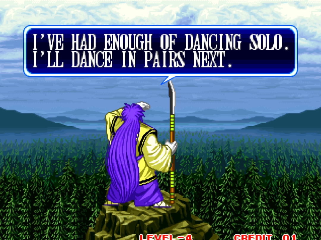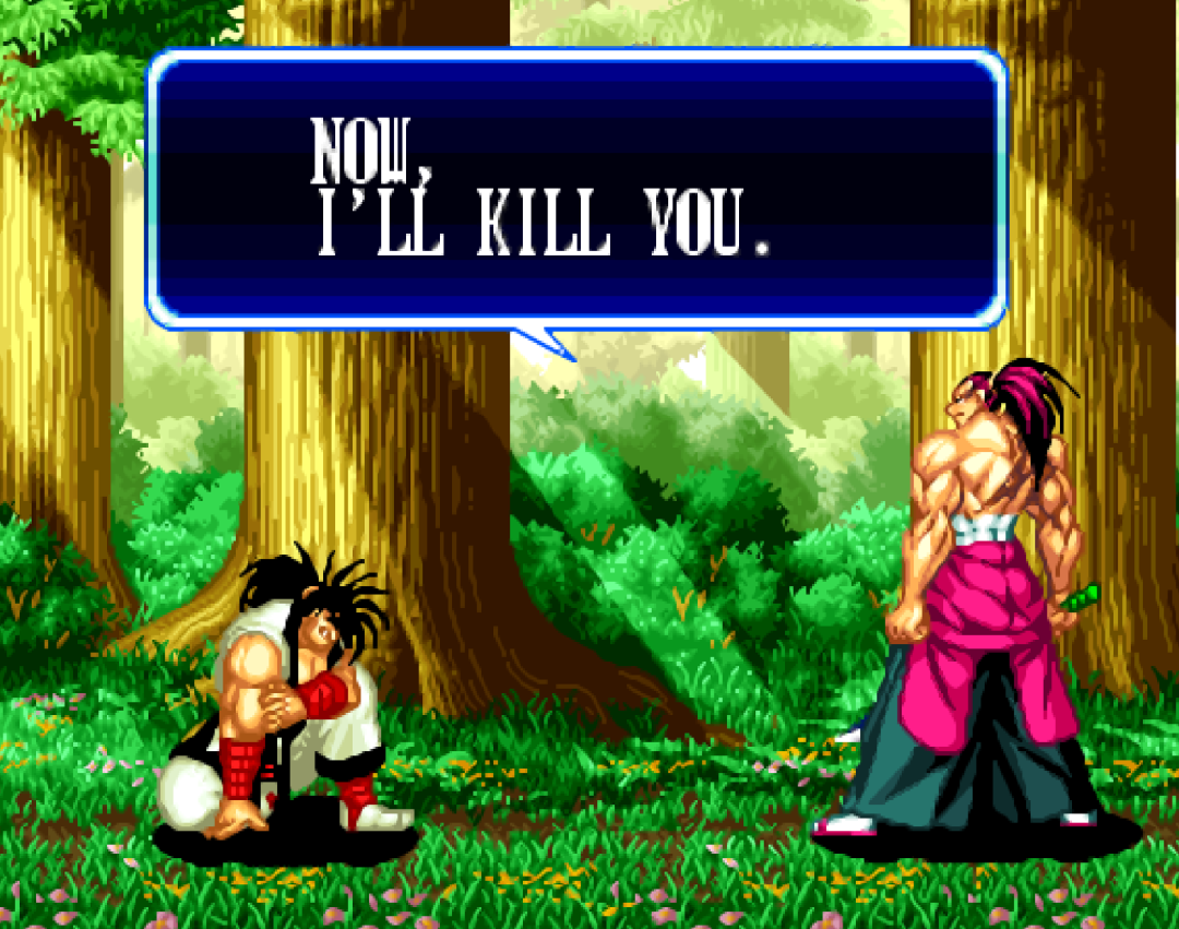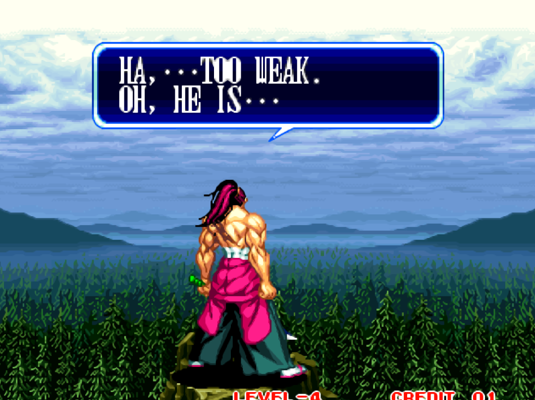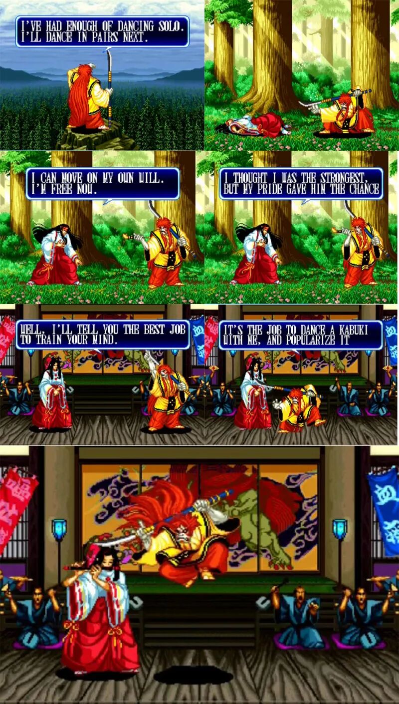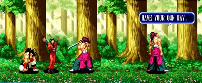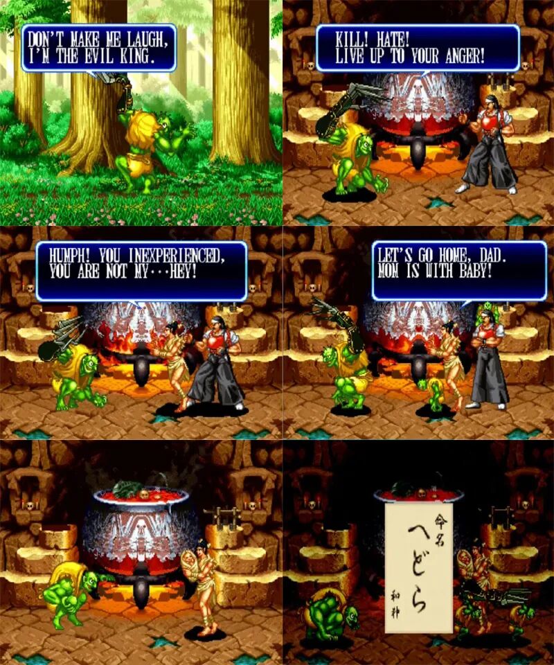 《侍魂》系列比较有意思,日文版翻译都很贴合,但是英文版翻译却很憋足。可能是开发这款游戏的时候并没有请英语方面的顾问吧!