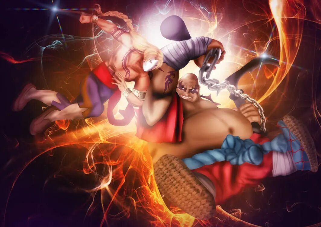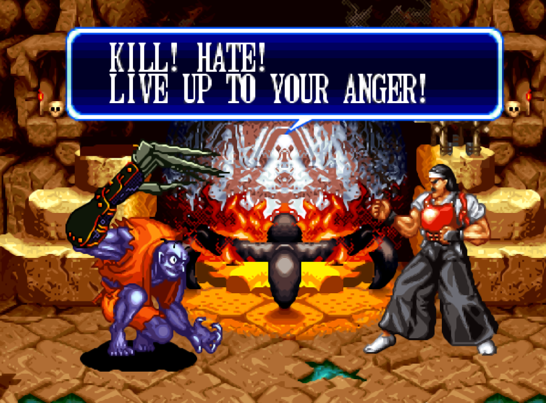 《真侍魂》时期,霸王丸地狱变成功击败了罗将神,在本次战斗中牙神幻十郎也偷偷出了不少力。在除魔之后,霸王神深受重伤,刚好被牙神捡漏。