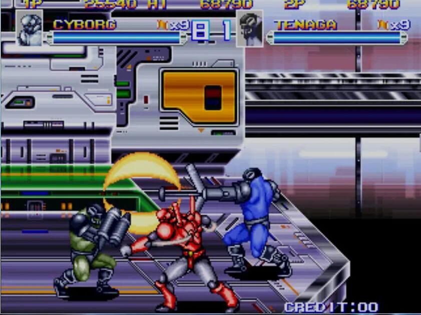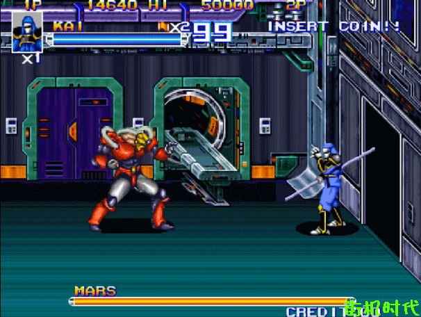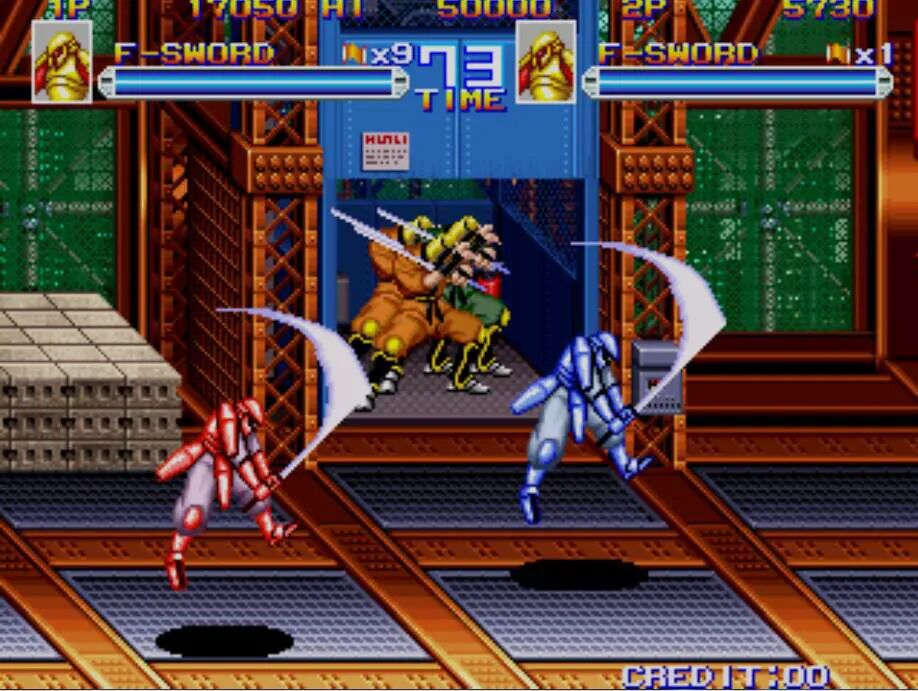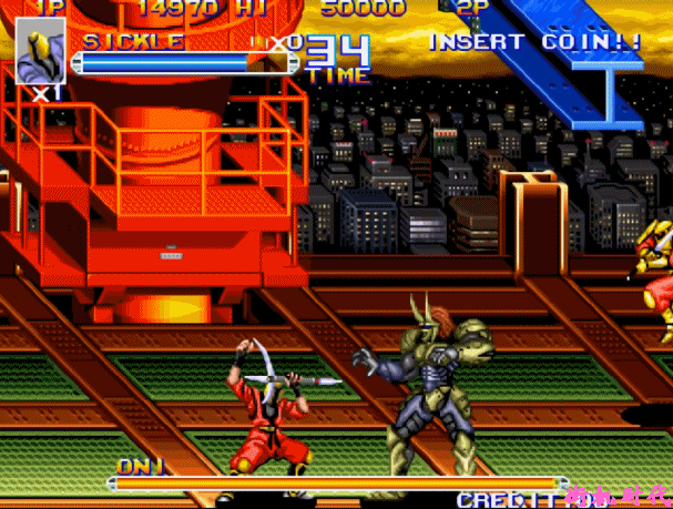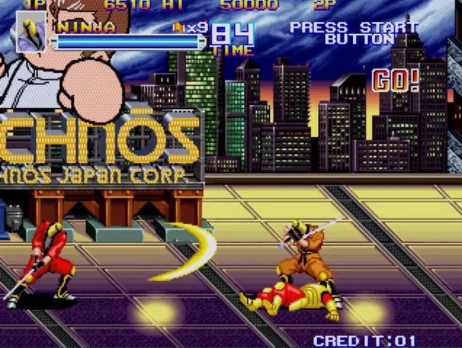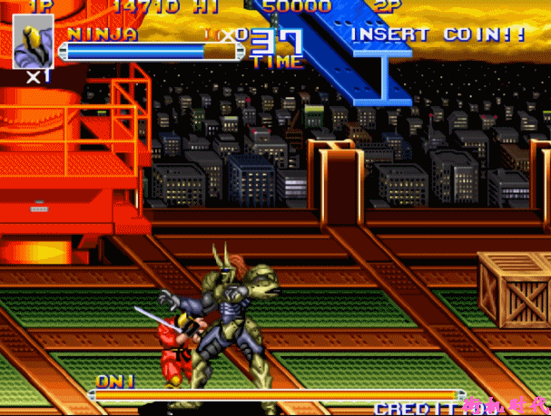 游戏厅的《变身忍者》都是日版的,因此我们都习惯了这个版本,过关之后没有双人对战的设定,而且可以奖命,食物的补血效果也非常好。