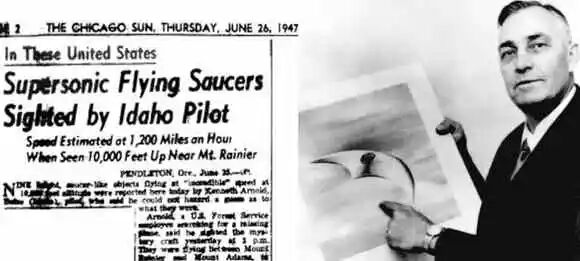 需要说明下,目击的所谓不明现象,或者用一个大家熟悉的称呼——UFO更合适,但UFO现象本意是指不明飞行物,所谓飞碟一般认为是来源自二战后的1947年,飞行员肯尼斯·阿诺德目击到华盛顿州雷尼尔山附近发现的UFO现象,后来媒体用上了所谓“飞碟”来称呼,也导致后来一说UFO大家第一反应就认为该是圆盘形状。