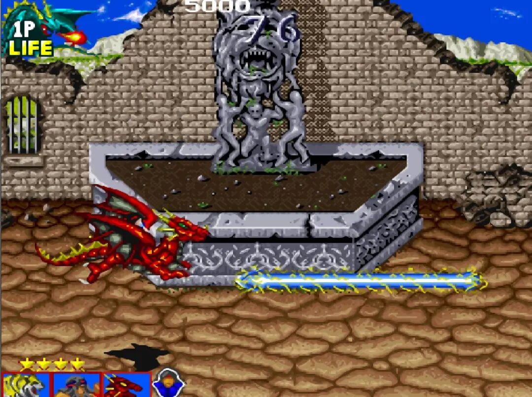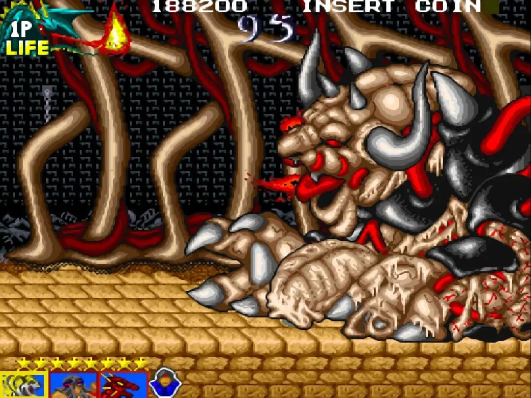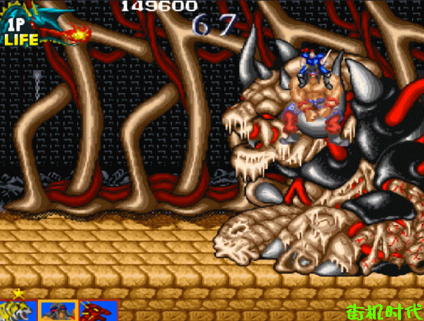 飞龙的触发需要道具,只要成功变身就会进入几乎无敌状态,发射出激光光线,威力比较强大。以前我玩的时候,飞龙总是见不到BOSS,要是能见到的话说不定可以秒杀。
