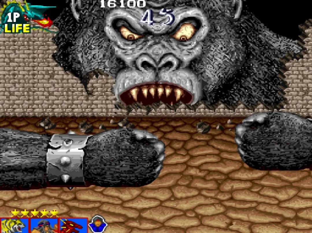 另外,在游戏中还出现了一只巨型的大猩猩,使用两个拳头进行攻击。咋一眼看上去整个屏幕都是它的攻击范围。第一次玩就是在这里交代的,连它的弱点在哪里都不知道。后来看到别人玩才知道,打手就可以了。
