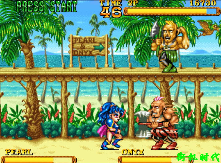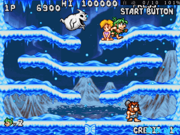 《战斗原始人2》摒弃了最初的玩法,学《雪人兄弟》变成了爬层类的游戏,将之前版本中的元素加入到游戏中,在当时来说还是很有人气的。每一关都能看到一个漂亮的妹子。