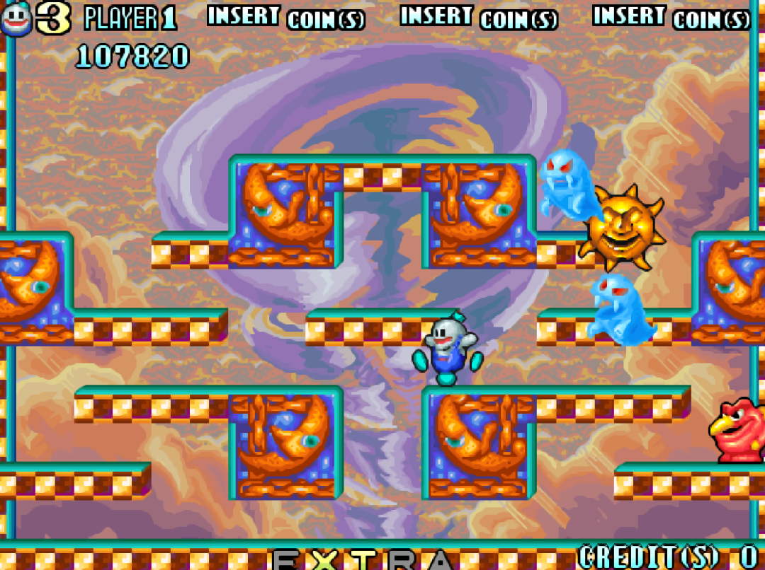 在《雪人兄弟2》中太阳神取代了南瓜头,成为游戏中的GM。它出现的时间还算比较迟,时间没有一代那么紧迫了。
