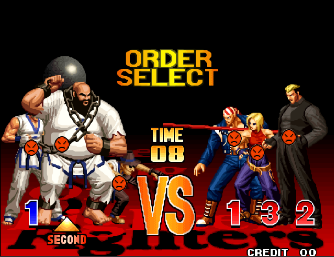 《拳皇97》比较有意思,能量是可以继承的,而能不能继承就看挨着的两个选手在剧情中的关系如何了(好感度)。另外,即使是不认识的人,只要兴趣爱好相同也有可能完美继承能量。特别是坏蛋们,臭味相同的他们总是可以相互接气。