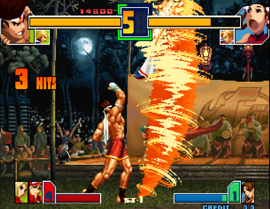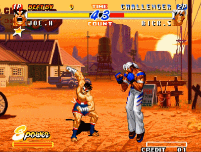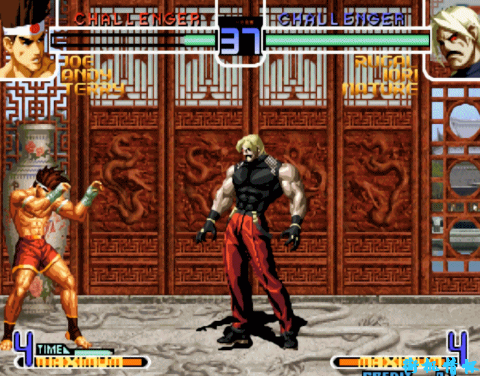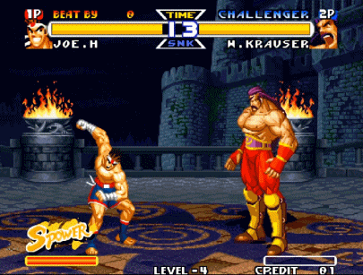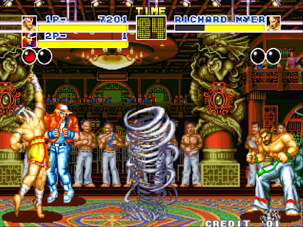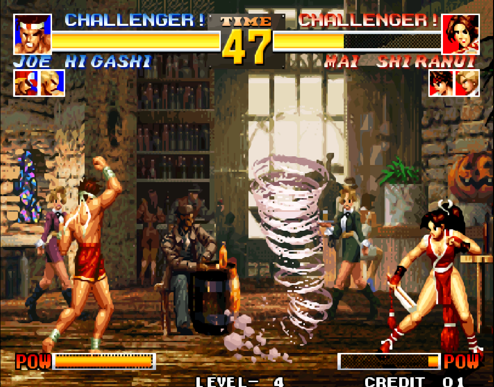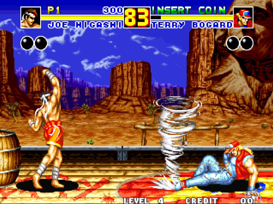 因此我们可以看到94年发行的《拳皇》中,东丈的旋风效果和《饿狼传说》前期版本比较相似,动作和效果几乎一样的。