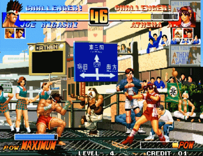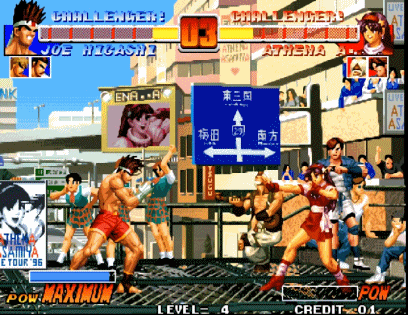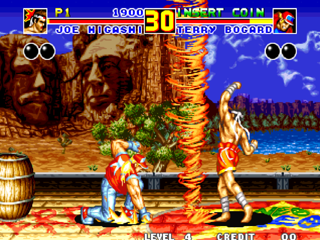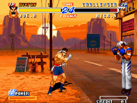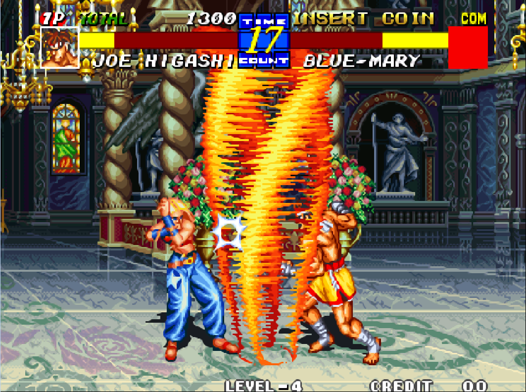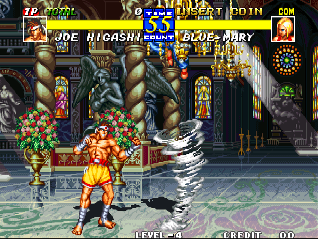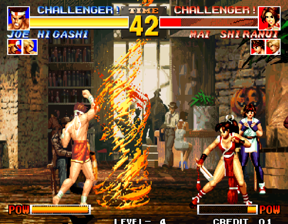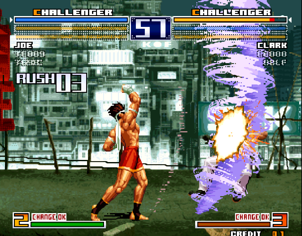 因此我们可以看到94年发行的《拳皇》中,东丈的旋风效果和《饿狼传说》前期版本比较相似,动作和效果几乎一样的。