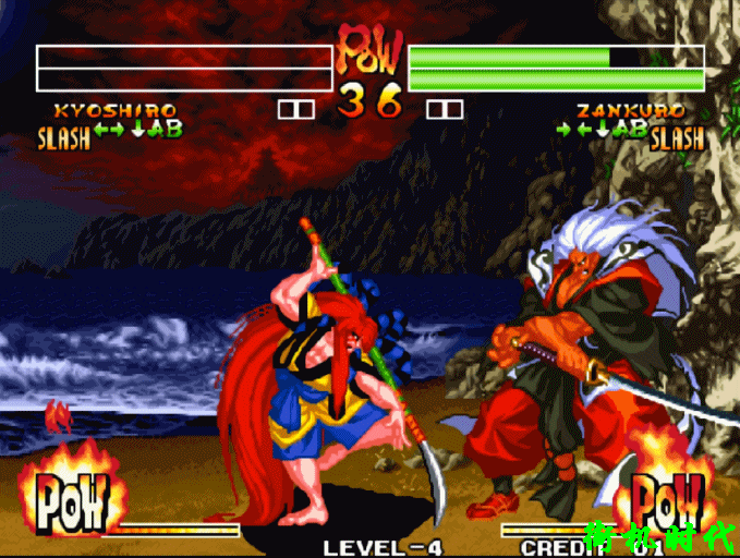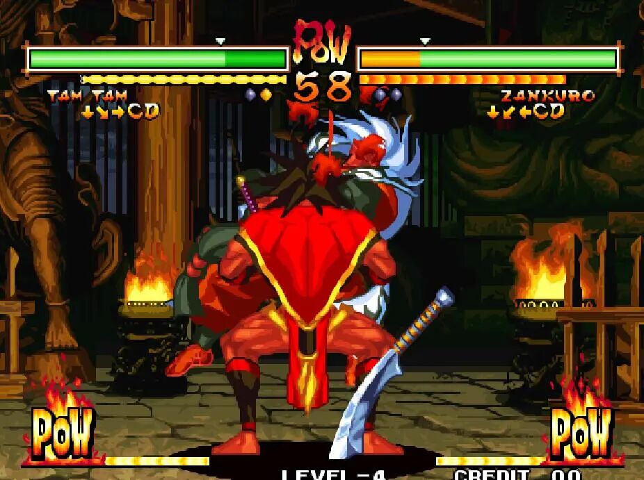 千两狂死郎在《真侍魂》时期的投技比较简单,没有武器时就用头发来勒。而到了《侍魂4》居然可以召唤出一只癞蛤蟆,直接将对手给吞下去。