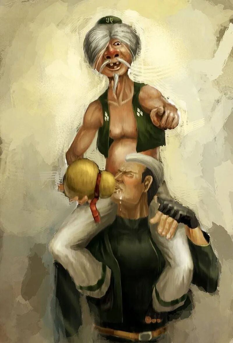 镇元斋的投技当年就没有看明白到底是怎么回事。一直以为是他用大腿夹住对手的头而产生的伤害。但是多年后,再次体验游戏时,依稀能够听到“咕噜咕噜”的声音。这哪是在勒人嘛?而是在强行灌酒。