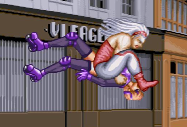 《豪血寺一族》安吉拉,这位肌肉美女总是喜欢将对手抓住之后从天上坐下来。甚至还能实现空擒。