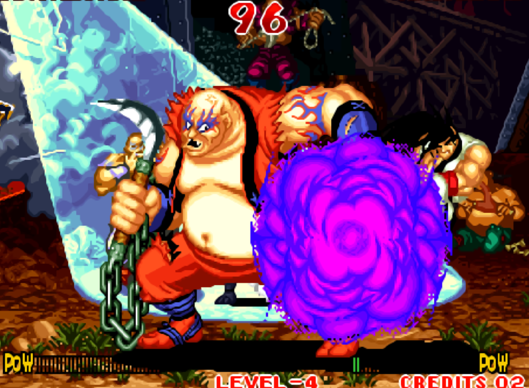 《侍魂1》中的地震很无耻,因为身躯比较庞大,对手无法对他使用投技。而到了二代中,他和黑子被别人投,都有专属的动作。地震抓人的方法也有两种,要么扔出去,要么蹦出一个屁。