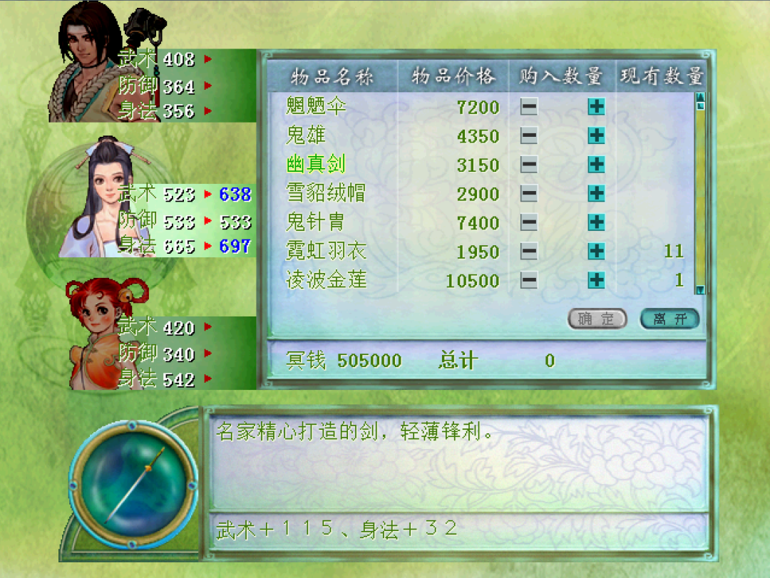 《仙剑2》的投掷伤害同样给力,只是武器获取途径很少,后期有钱后连商店都没有了。兜售最好的道具,只有鬼都这里的商店。包括:魍魉伞、鬼雄和幽真剑