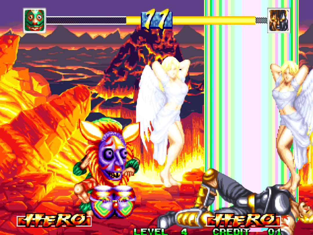 必杀技随机出现漂亮天使或者壮硕天神,直接将对手带走,然后对手的血槽不断流失。或许大家感觉不到必杀技的残忍,但是细思极恐啊!明明是天神的引导,却让人身负重伤。