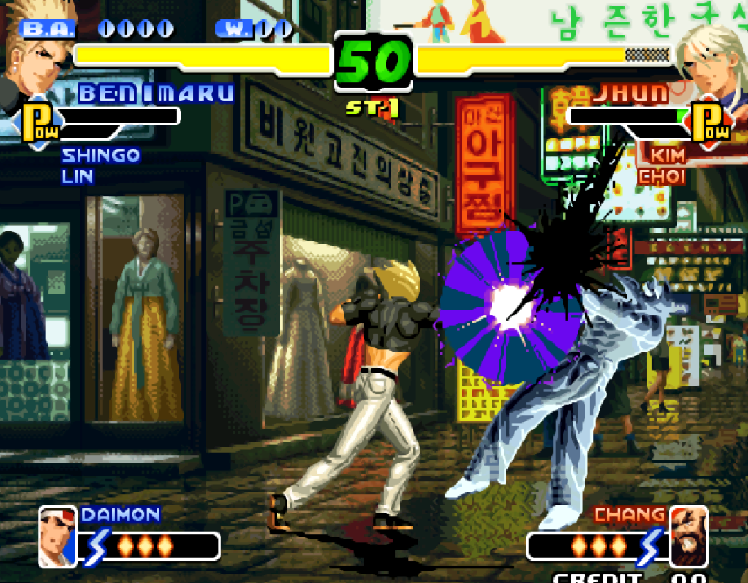 红丸、草薙京和大门五郎都是《拳皇94》第一次出场的,没有在龙虎和饿狼之类的游戏中进行打磨过,不过他们的招式雏形已经基本上确定了。