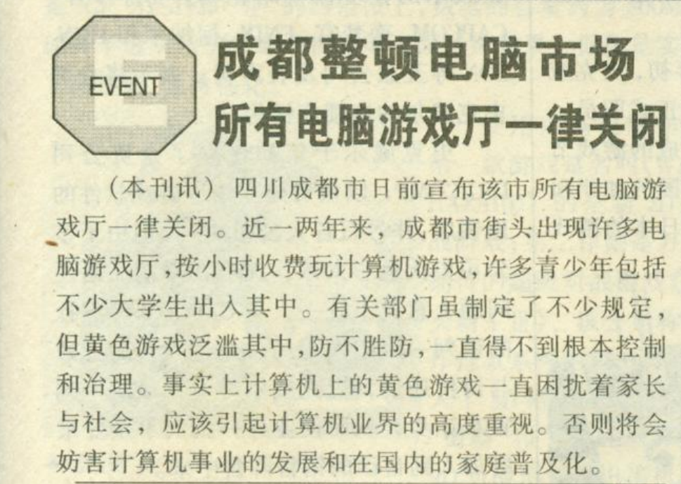 在《电子游戏软件》第27期,也就是1996年10份的内容中我们看到,当年成都就暂停过所有的电脑游戏厅,当时还不叫网吧!